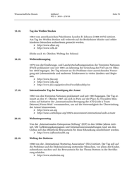 Wissenschaftliche Dienste Infobrief Seite 70 WD 1 - 3010 – 270/10 15.10. Tag des Weißen Stockes 1964 vom amerikanischen Präsidenten Lyndon B. Johnson (1908-1973) initiiert. Am Tag des Weißen Stockes soll weltweit auf die Bedürfnisse blinder und sehbe- hinderter Menschen aufmerksam gemacht werden. http://www.dbsv.org http://www.vdk.de (Siehe auch 13. Oktober, Welttag des Sehens) 16.10. Welternährungstag 1979 von der Ernährungs- und Landwirtschaftsorganisation der Vereinten Nationen (FAO) proklamiert und seit 1981 am Jahrestag der Gründung der FAO am 16. Okto- ber 1945 begangen. Der Tag erinnert an die Probleme einer ausreichenden Versor- gung mit Lebensmitteln und sauberem Trinkwasser in vielen Ländern und Regio- nen. http://www.fao.org http://www.wfp.org http://www.fao.org/getinvolved/worldfoodday/en 17.10. Internationaler Tag der Beseitigung der Armut 1992 von den Vereinten Nationen proklamiert und seit 1993 begangen. Der Tag er- innert an den 17. Oktober 1987, als sich in Paris auf der Place du Trocadéro Men- schen auf Initiative der „Internationalen Bewegung der ATD (Aide à Toute Détresse) Vierte Welt“ versammelten, um auf die Notwendigkeit der Überwindung der Armut hinzuweisen. http://www.un.org http://news.catholique.org/10924-mouvement-international-aide-a-toute 20.10. Weltosteoporosetag Von der „Internationalen Osteoporose Stiftung“ (IOF) in den 1990er Jahren initi- iert. Mit Aufklärungskampagnen und Informationsveranstaltungen rund um den Globus soll das öffentliche Bewusstsein für diese Erkrankung sensibilisiert werden. http://www.iofbonehealth.org 22.10. Welttag des Stotterns 1998 von der „International Stuttering Association“ (ISA) initiiert. Der Tag soll auf die Probleme und die Diskriminierung stotternder Menschen, vor allem der Kinder, aufmerksam machen und das Bewusstsein für das Thema Stottern in der Bevölke- rung schärfen. http://www.stutterisa.org