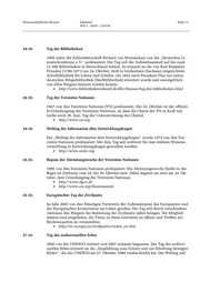 Wissenschaftliche Dienste Infobrief Seite 71 WD 1 - 3010 – 270/10 24.10. Tag der Bibliotheken 1995 unter der Schirmherrschaft Richard von Weizsäckers von der „Deutschen Li- teraturkonferenz e.V.“ proklamiert. Der Tag soll die Aufmerksamkeit auf die rund 11.500 Bibliotheken in Deutschland lenken. Er erinnert an die von Karl Benjamin Preusker (1786-1871) am 24. Oktober 1828 in Großenhain (Sachsen) eingerichtete Schulbibliothek für Lehrer und Schüler, die 1832 nach Preuskers Plan zur ersten deutschen Bürgerbibliothek (Stadtbibliothek) erweitert wurde und unentgeltlich von allen Bürgern benutzt werden konnte. http://www.bibliotheksverband.de/dbv/themen/tag-der-bibliotheken.html 24.10. Tag der Vereinten Nationen 1947 von den Vereinten Nationen (VN) proklamiert. Der 24. Oktober ist der offiziel- le Gründungstag der Vereinten Nationen, an dem die Charta der VN in Kraft trat (siehe auch 26. Juni, Tag der Unterzeichnung der Charta). http://www.un.org 24.10. Welttag der Information über Entwicklungsfragen Der „Welttag der Information über Entwicklungsfragen“ wurde 1972 von den Ver- einten Nationen proklamiert. Mit dem Tag soll weltweit für eine stärkere Wissens- vermittlung in Entwicklungsfragen geworben werden. http://www.unric.org 24.10. Beginn der Abrüstungswoche der Vereinten Nationen 1995 von den Vereinten Nationen proklamiert. Die Abrüstungswoche findet in der Regel im Zeitraum vom 24. bis 30. Oktober statt. Dabei beginnt sie stets am 24. Ok- tober, dem Gründungstag der Vereinten Nationen. http://www.dgvn.de http://www.un.org/disarmament 25.10. Europäischer Tag der Ziviljustiz Im Jahr 2003 von den Ständigen Vertretern der Außenminister des Europarates und der Europäischen Kommission ins Leben gerufen. Der Tag soll durch verschiedene Aktionen den Bürgern die Bedeutung der Ziviljustiz näher bringen. Die Mitglied- staaten sind eingeladen, die Türen zu ihren Gerichten zu öffnen und Treffen mit Rechtsexperten zu veranstalten. http://ec.europa.eu/civiljustice/index_en.htm 27.10. Tag des audiovisuellen Erbes 2005 von der UNESCO initiiert und 2007 erstmals begannen. Der Tag des audiovi- suellen Erbes erinnert an die „Empfehlung zum Schutz und zur Erhaltung bewegter Bilder“, die die UNESCO am 27. Oktober 1980 verabschiedet hat. Der Welttag soll