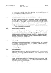 Wissenschaftliche Dienste Infobrief Seite 72 WD 1 - 3010 – 270/10 das audiovisuelle Kulturerbe stärker in das öffentliche Bewusstsein rücken und auf die Notwendigkeit seines Schutzes hinweisen. http://www.unesco.de 28.10. 125. Jahrestag der Einweihung der Freiheitsstatue in New York 1886 Die Statue of Liberty, offiziell „Liberty Enlightening the World“, umgangssprach- lich auch „Miss Liberty“ oder „Lady Liberty“genannt, wurde am 28. Oktober 1886 eingeweiht. Sie war ein Geschenk Frankreichs an die Vereinigten Staaten und soll- te ursprünglich 1876 zur Hundertjahrfeier der amerikanischen Unabhängigkeitser- klärung von 1776 vollendet werden. Für Generationen von Einwanderern in die USA galt das Bauwerk an der Hafeneinfahrt in New York als Symbol der Freiheit. http://www.nps.gov/stli/index.htm 28.10. Weltspartag* (in Deutschland) 1924 vom ersten Internationalen Sparkassenkongress in Mailand proklamiert und auf den 31. Oktober, den Schlusstag des Kongresses, festgesetzt. Die Vereinten Na- tionen erklärten das Datum 1989 offiziell zum Weltspartag. Um eine Überschnei- dung mit dem Reformationstag zu vermeiden, wird der Tag in Deutschland häufig bereits am letzten Werktag vor dem 31. Oktober – im Jahr 2010 am 29. Oktober – begangen, an dem Banken geöffnet haben. http://www.weltspartag.net 28.10. Weltpoliotag 1998 von der Weltgesundheitsorganisation WHO initiiert und auf den 28. Oktober, den Geburtstag des amerikanischen Arztes und Entdeckers des Poliomyelitisvirus, Jonas Salk (1914-1995), terminiert. http://www.who.int http://dgk.de 29.10. Weltschlaganfalltag 2006 von der „Weltschlaganfall-Organisation“ (WSO) ins Leben gerufen, um unter anderem das Bewusstsein der Öffentlichkeit für das Thema Schlaganfall zu stärken. http://www.world-stroke.org 29.10 Welt-Psoriasis-Tag Von der „International Federation of Psoriasis Associations“ (IFPA) im Jahr 2004 proklamiert. Mit dem Welt-Psoriasis-Tag soll auf die Lage der an Schuppenflechte Erkrankten aufmerksam gemacht werden. http://www.worldpsoriasisday.com
