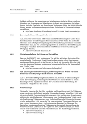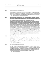 Wissenschaftliche Dienste Infobrief Seite 76 WD 1 - 3010 – 270/10 20.11. Deutscher Lebertag 1999 von der „Gastro-Liga e.V.“ als bundesweiter Aktionstag ins Leben gerufen. Ziel ist es, die Bevölkerung auf Lebererkrankungen und ihre Folgen aufmerksam zu machen. http://www.lebertag.org 20.11. Weltgedenktag für die Straßenverkehrsopfer* 1995 wurde von den Vereinten Nationen zum Gedenken an die Opfer des Straßen- verkehrs und das Leid ihrer Familienangehörigen der dritte Sonntag im November zum Weltgedenktag für die Straßenverkehrsopfer erklärt. http://www.who.int/roadsafety/projects/world_day/en/index.html http://www.worlddayofremembrance.org 21.11. Welttag des Fernsehens 1996 von den Vereinten Nationen proklamiert und seit 1997 begangen. Dieser Tag soll an das erste Weltfernsehforum der Vereinten Nationen am 21. und 22. Novem- ber 1996 erinnern. Der Tag wurde aufgrund der großen gesellschaftlichen und kul- turellen Bedeutung des Mediums und seines Einflusses auf die Meinungsbildung ausgerufen. http://www.unesco.org 24.11. 50. Jahrestag der Einrichtung der Zentralen Erfassungsstelle Salzgitter 1961 Am 26. November 1961 nahm die von allen Bundesländern finanzierte „Zentrale Beweismittel- und Dokumentationsstelle der Landesjustizverwaltungen“ (ZESt) in Salzgitter ihre Arbeit auf. Hauptaufgabe war es, Hinweisen auf durchgeführte oder versuchte Tötungshandlungen beispielsweise an der innerdeutschen Grenze oder politische Verfolgung in der DDR nachzugehen und Beweise zu sichern. Dazu sammelte und dokumentierte die Einrichtung beispielweise Zeugenaussagen von DDR-Bürgern, die in die Bundesrepublik geflüchtet waren. In den 1980er Jahren gab es seitens der SPD immer wieder Forderungen, die Einrichtung abzuschaffen. Nach der Wiedervereinigung hatte sich der Auftrag der Zentralen Erfassungsstelle erfüllt, da die juristische Aufarbeitung und Verfolgung von Straftaten von den ört- lichen Strafverfolgungsbehörden übernommen wurden. 1992 wurde die ZESt auf- gelöst. Die Akten der Behörde lagern heute im Bundesarchiv in Koblenz. 25.11. Internationaler Tag für die Beseitigung der Gewalt gegen Frauen 1999 von den Vereinten Nationen proklamiert. An diesem Tag sollen Aktivitäten organisiert werden, die darauf abzielen, die Öffentlichkeit stärker für das Problem der Gewalt gegen Frauen zu sensibilisieren. http://www.terre-des-femmes.de http://www.un.org/womenwatch