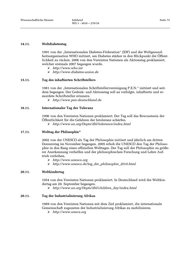 Wissenschaftliche Dienste Infobrief Seite 75 WD 1 - 3010 – 270/10 14.11. Weltdiabetestag 1991 von der „Internationalen Diabetes-Föderation“ (IDF) und der Weltgesund- heitsorganisation WHO initiiert, um Diabetes stärker in den Blickpunkt der Öffent- lichkeit zu rücken. 2006 von den Vereinten Nationen als Aktionstag proklamiert, welcher erstmals 2007 begangen wurde. http://www.who.int http://www.diabetes-union.de 15.11. Tag des inhaftierten Schriftstellers 1981 von der „Internationalen Schriftstellervereinigung P.E.N.“ initiiert und seit- dem begangen. Der Gedenk- und Aktionstag soll an verfolgte, inhaftierte und er- mordete Schriftsteller erinnern. http://www.pen-deutschland.de 16.11. Internationaler Tag der Toleranz 1996 von den Vereinten Nationen proklamiert. Der Tag soll das Bewusstsein der Öffentlichkeit für die Gefahren der Intoleranz schärfen. http://www.un.org/Depts/dhl/tolerance/index.html 17.11. Welttag der Philosophie* 2002 von der UNESCO als Tag der Philosophie initiiert und jährlich am dritten Donnerstag im November begangen. 2005 erhob die UNESCO den Tag der Philoso- phie in den Rang eines offiziellen Welttages. Der Tag soll der Philosophie zu größe- rer Anerkennung verhelfen und der philosophischen Forschung und Lehre Auf- trieb verleihen. http://www.unesco.org http://www.unesco.de/tag_der_philosophie_2010.html 20.11. Weltkindertag 1954 von den Vereinten Nationen proklamiert. In Deutschland wird der Weltkin- dertag am 20. September begangen. http://www.un.org/Depts/dhl/children_day/index.html 20.11. Tag der Industrialisierung Afrikas 1989 von den Vereinten Nationen mit dem Ziel proklamiert, die internationale Gemeinschaft zugunsten der Industrialisierung Afrikas zu mobilisieren. http://www.uneca.org