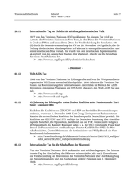 Wissenschaftliche Dienste Infobrief Seite 77 WD 1 - 3010 – 270/10 29.11. Internationaler Tag der Solidarität mit dem palästinensischen Volk 1977 von den Vereinten Nationen (VN) proklamiert. An diesem Tag wird am Amtsitz der Vereinten Nationen in New York, in den Büros der Vereinten Nationen in Genf und Wien und an anderen Orten der Verabschiedung der Resolution 181 (II) durch die Generalversammlung der VN am 29. November 1947 gedacht, die die Teilung des britischen Mandatsgebiets in Palästina in einen palästinensischen und einen israelischen Staat vorsah. Sie wurde von den israelischen Repräsentanten akzeptiert, von den arabischen Staaten aber abgelehnt, obwohl sie die Grundlage für einen Staat Palästina bot. http://www.un.org/Depts/dhl/palestinian/index.html – Dezember – 01.12. Welt-AIDS-Tag 1988 von den Vereinten Nationen ins Leben gerufen und von der Weltgesundheits- organisation WHO zum ersten Mal durchgeführt. 1996 richteten die Vereinten Na- tionen zur Koordinierung ihrer internationalen Aktivitäten im Bereich der AIDS- Prävention ein eigenes Programm ein (UNAIDS), das auch den Welt-AIDS-Tag aus- ruft. http://www.unaids.org http://www.welt-aids-tag.de 01.12. 45. Jahrestag der Bildung der ersten Großen Koalition unter Bundeskanzler Kurt Georg Kiesinger 1966 Nachdem die Koalition aus CDU/CSU und FDP am Streit über Steuererhöhungen zerbrach, wurde am 1. Dezember 1966 Kurt Georg Kiesinger vom Parlament zum Kanzler der ersten Großen Koalition der Bundesrepublik Deutschland gewählt. Die Koalition aus CDU/CSU und SPD verfügte im Deutschen Bundestag über eine über- ragende Mehrheit, die Opposition, bestehend aus der FDP, verzeichnete lediglich 49 Abgeordnete. Im Kabinett Kiesinger saßen u. a. der CSU-Vorsitzende Franz Josef Strauß als Finanzminister, der Hamburger Senator Karl Schiller (SPD) als Wirt- schaftsminister, Gustav Heinemann als Justizminister und Willy Brandt als Vize- kanzler und Außenminister. http://www.bundestag.de/dokumente/textarchiv/serien/24037675_wahlperi oden_serie/25452018_wahlperioden05/index.jsp 02.12. Internationaler Tag für die Abschaffung der Sklaverei Von den Vereinten Nationen 1949 proklamiert und seitdem begangen. Der Interna- tionale Tag der Abschaffung der Sklaverei erinnert jedes Jahr am 2. Dezember an die Verabschiedung der Konvention der Vereinten Nationen über die Bekämpfung des Menschenhandels und der Ausbeutung anderer Personen (am 2. Dezember) 1949. http://www.un.org/Depts/dhl/slavery