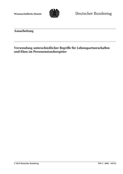 Wissenschaftliche Dienste Ausarbeitung Seite 2 WD 3 - 3000 - 193/19 Verwendung unterschiedlicher Begriffe für Lebenspartnerschaften und Ehen im Personenstandsregister Aktenzeichen: WD 3 - 3000 - 193/19 Abschluss der Arbeit: 10. September 2019 Fachbereich: WD 3: Verfassung und Verwaltung Die Wissenschaftlichen Dienste des Deutschen Bundestages unterstützen die Mitglieder des Deutschen Bundestages bei ihrer mandatsbezogenen Tätigkeit. Ihre Arbeiten geben nicht die Auffassung des Deutschen Bundestages, eines seiner Organe oder der Bundestagsverwaltung wieder. Vielmehr liegen sie in der fachlichen Verantwortung der Verfasserinnen und Verfasser sowie der Fachbereichsleitung. Arbeiten der Wissenschaftlichen Dienste geben nur den zum Zeitpunkt der Erstellung des Textes aktuellen Stand wieder und stellen eine individuelle Auftragsarbeit für einen Abgeordneten des Bundestages dar. Die Arbeiten können der Geheimschutzordnung des Bundestages unterliegende, geschützte oder andere nicht zur Veröffentlichung geeignete Informationen enthalten. Eine beabsichtigte Weitergabe oder Veröffentlichung ist vorab dem jeweiligen Fachbereich anzuzeigen und nur mit Angabe der Quelle zulässig. Der Fachbereich berät über die dabei zu berücksichtigenden Fragen.