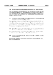 Drucksache 18/8009 Bayerischer Landtag 18. Wahlperiode Seite 5/5 7.2 Werden die betroffenen Bürger über die Löschung ihrer Daten informiert? Nein, eine gesonderte Information Betroffener über die Löschung der Daten nach dem IfSG oder polizeilich gespeicherter Daten ist gesetzlich nicht vorgesehen und erfolgt daher nicht. Betroffene haben den europarechtlichen Datenschutzvorgaben entsprechend je- doch unter anderem das Recht, Auskunft über gespeicherte, sie betreffende, personen- bezogene Daten zu verlangen. 8.1 Welche kurzfristigen und langfristigen Ergebnisse erwartet die Staatsregierung jeweils durch die Übermittlung der Daten? Das regelmäßige Erheben der meldepflichtigen Infektionskrankheiten dient der Sur- veillance übertragbarer Krankheiten. Sie ist eine wichtige Säule der Infektionsprävention. Die Übermittlung personenbezogener Daten der Polizei an die Landratsämter dient insbesondere dem rechtsstaatlichen Fortgang von Ordnungswidrigkeitenverfahren bzw. der Weitergabe von für die Bekämpfung der Corona-Pandemie erforderlichen In- formationen an die originär zuständige Behörde. 8.2 Welche Pläne bestehen, die erhobenen Daten über den ursprünglichen Zweck des Seuchenschutzes hinaus für staatliche Ziele zu nutzen? Über die oben dargestellten Zwecke hinaus ist keine Nutzung von anlässlich der Coro- na-Pandemie erhobenen Daten durch die Bayerische Polizei intendiert. 8.3 In welcher Hinsicht könnten die erhobenen Daten für zusätzliche Bereiche nutzbringend sein? Die potenzielle Nützlichkeit von erhobenen Daten über die genannten Zwecke hinaus, kann nicht beurteilt werden.