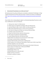 Wissenschaftliche Dienste Dokumentation Seite 7 WD 1 - 3000 - 010/18 6 3. Internationale Pressestimmen zum „Holocaust-Gesetz“ Die Bundeszentrale für politische Bildung hat verschiedene ausländische Wortbeiträge zur Frage „Welche Konsequenzen hat Polens Holocaust-Gesetz?“ übersetzt und online zur Verfügung ge- stellt: https://www.eurotopics.net/de/193410/welche-konsequenzen-hat-polens-holocaust-ge- setz# Ferner finden sich im Anhang folgende englisch- und französischsprachige Pressetexte aus den USA, Großbritannien, Israel und Frankreich: 1) 'Holocaust law' stokes U.S.-Polish tensions 2) Poland: group sues Argentinian newspaper under new Holocaust law 3) Israel and Poland in talks to resolve conflict over Holocaust blame law 4) BDS and the Polish Holocaust law: A lesson in EU inconsistency 5) How Israel, the Diaspora and Poland can overcome Holocaust debate 6) In Poland, a grass-roots Jewish revival 7) Poland’s Jews fear for future under new Holocaust law 8) Old wrongs and unpleasant misunderstandings 9) Israelis helping Poland play with Holocaust denial 10) Dear Poland: Your Holocaust Law Fools No One. No One Forgets 11) In Europe, revisionist history is taking shape 12) Senior Polish lawmaker calls for pause on Holocaust law 13) The Guardian view on Holocaust responsibility: Poland cannot wholly escape blame 14) Poland unleashes its own inner demons 15) Israel and Poland have found some common ground: their denial of holocausts 16) Une relecture de l’histoire face à l’Holocauste OPINION 17) No legislation can rewrite history 18) Charlemagne: History wars 19) Polish Holocaust law is about the truth 20) Why the Poles are frustrated 21) Poland's crackdown on speech 6 Siehe Anlage 2