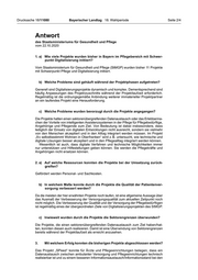 Drucksache 18/11080 Bayerischer Landtag 18. Wahlperiode Seite 2/4 Antwort des Staatsministeriums für Gesundheit und Pflege vom 22.10.2020 1. a) Wie viele Projekte wurden bisher in Bayern im Pflegebereich mit Schwer- punkt Digitalisierung initiiert? Vom Staatsministerium für Gesundheit und Pflege (StMGP) wurden bisher 11 Projekte mit Schwerpunkt Pflege und Digitalisierung initiiert. b) Welche Probleme sind gehäuft während der Projektphasen aufgetreten? Generell sind Digitalisierungsprojekte dynamisch und komplex. Dementsprechend sind häufig Anpassungen des Projektzuschnitts während der Projektlaufzeit erforderlich. Regelmäßig ist die ordnungsgemäße Anbindung weiterer immaterieller Projektpartner an ein laufendes Projekt eine Herausforderung. c) Welche Probleme wurden bevorzugt durch die Projekte angegangen? Die Projekte hatten einen sektorenübergreifenden Datenaustausch oder das Erlebbarma- chen der Vorteile von intelligenten Assistenzsystemen in der Pflege für Pflegebedürftige, Angehörige und Pflegende zum Ziel. Von Bedeutung ist dabei insbesondere, dass lediglich der Einsatz von digitalen Entwicklungen nicht ausreicht, sondern sie vielmehr von den Menschen akzeptiert und in den Alltag integriert werden müssen. Im Projekt „9 x selbstbestimmt Wohnen in Oberfranken“ wird z. B. untersucht, wie technische und digitale Lösungen besser akzeptiert und in den Pflegealltag integriert werden können. Wesentlich ist auch, dass digitale Verfahren und technische Möglichkeiten immer nur unterstützen und Hilfestellungen geben können. Sie werden die Pflegekräfte und Angehörigen nicht ersetzen können. 2. a) Auf welche Ressourcen konnten die Projekte bei der Umsetzung zurück- greifen? Gefördert werden Personal- und Sachkosten. b) In welchem Maße konnte durch die Projekte die Qualität der Patientenver- sorgung verbessert werden? Da die meisten der hier erwähnten Projekte noch laufen, ist eine allgemeine Aussage über das Ausmaß der Verbesserung der Versorgungsqualität zum aktuellen Zeitpunkt noch nicht möglich. Die Verbesserung der Qualität und der Versorgung der Pflegebedürftigen ist regelmäßig eines der übergeordneten Ziele von Digitalisierungsprojekten des StMGP. c) Inwieweit wurden durch die Projekte die Sektorengrenzen überwunden? Die Projekte, die einen sektorenübergreifenden Datenaustausch zum Ziel haben/hat- ten, konnten diesen auch realisieren. Damit ist eine Überwindung von Sektorengrenzen bereits während der Projektlaufzeit als erreicht anzusehen. 3. Mit welchem Erfolg konnten die bisherigen Projekte abgeschlossen werden? Das Projekt „SPeed“ konnte für Ärzte und Pflegeeinrichtungen belegen, dass ein Datenaustausch zwischen ambulanter Versorgung und Pflegeeinrichtungen technisch realisierbar ist und zu einem besseren Informationsaustausch/Informationsstand bei den