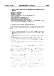 18. Wahlperiode 15.01.2021 Drucksache 18/11080 Schriftliche Anfrage des Abgeordneten Dr. Dominik Spitzer FDP vom 16.09.2020 Digitalisierungsprojekte im Pflegebereich Ich frage die Staatsregierung: 1. a) Wie viele Projekte wurden bisher in Bayern im Pflegebereich mit Schwer- punkt Digitalisierung initiiert?............................................................................... 2 1. b) Welche Probleme sind gehäuft während der Projektphasen aufgetreten?.......... 2 1. c) Welche Probleme wurden bevorzugt durch die Projekte angegangen?.............. 2 2. a) Auf welche Ressourcen konnten die Projekte bei der Umsetzung zurück- greifen?................................................................................................................ 2 2. b) In welchem Maße konnte durch die Projekte die Qualität der Patientenver- sorgung verbessert werden?............................................................................... 2 2. c) Inwieweit wurden durch die Projekte die Sektorengrenzen überwunden?.......... 2 3. Mit welchem Erfolg konnten die bisherigen Projekte abgeschlossen wer- den?..................................................................................................................... 2 4. a) Welche der bisher erfolgreich abgeschlossenen Projekte wurden in die Regelversorgung übernommen?.......................................................................... 3 4. b) Unter welchen (rechtlichen) Rahmenbedingungen wurden die Projekte in die Regelversorgung übernommen?.................................................................... 3 4. c) Wie werden die Projekte in der Regelversorgung finanziert?.............................. 3 5. a) Welche bisher durchgeführten Projekte wurden nicht in die Regelversorgung überführt (bitte Begründung jeweils mit angeben)?............................................. 3 5. b) Wie bewertet die Staatsregierung diesen Umstand?........................................... 3 6. a) Welche Projekte laufen aktuell im Pflegebereich mit Schwerpunkt Digitali- sierung?............................................................................................................... 4 6. b) Wie ist bei diesen Projekten der aktuelle Sachstand?......................................... 4 7. a) Welche Erkenntnisse konnten durch die bisher durchgeführten Modell- projekte im Bereich Digitalisierung für die Initiierung zukünftiger Projekte gewonnen werden?.............................................................................................. 4 7. b) Durch welche Maßnahmen der Staatsregierung wird die Digitalkompetenz der Bürger gestärkt?............................................................................................ 4 7. c) Wo sieht die Staatsregierung das größte Potential durch Digitalisierung im Gesundheits- und Pflegebereich?....................................................................... 4 Hinweis des Landtagsamts: Zitate werden weder inhaltlich noch formal überprüft. Die korrekte Zitierweise liegt in der Verantwortung der Fragestellerin bzw. des Fragestellers sowie der Staatsregierung. Drucksachen, Plenarprotokolle sowie die Tagesordnungen der Vollversammlung und der Ausschüsse sind im Internet unter www.bayern.landtag.de – Dokumente abrufbar. Die aktuelle Sitzungsübersicht steht unter www.bayern.landtag.de – Aktuelles/Sitzungen/Tagesübersicht zur Verfügung.