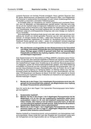 Drucksache 18/14398 Bayerischer Landtag 18. Wahlperiode Seite 2/5 2. Wie viele Beamte und Angestellte der Staatskanzlei sind zum Zeitpunkt der Beantwortung dieser Anfrage jeweils gegen COVID-19 geimpft (bitte Zahl der Beschäftigten und Woche der Impfung angeben und den Impfstoff angeben, der jeweils verabreicht wurde)? 3 3. Stand der Impfung der Mitglieder im Zuständigkeitsbereich des Staats- ministeriums für Gesundheit und Pflege 3 3.1 Wie viele im Staatsministeriums für Gesundheit und Pflege beschäftigte Beamte und Angestellte sind zum Zeitpunkt der Beantwortung dieser An- frage gegen COVID-19 geimpft (bitte Zahl der Beschäftigten und Woche der Impfung angeben)? 3 3.2 Wie viele Beamte und Angestellte des dem Staatsministerium für Gesund- heit und Pflege unterstellten Landesamts für Gesundheit und Lebensmittel- sicherheit (LGL) sind zum Zeitpunkt der Beantwortung dieser Anfrage gegen COVID-19 geimpft (bitte Zahl der Beschäftigten und Woche der Impfung angeben)? 3 3.3 Wie viele Amtsärzte in Bayern sind zum Zeitpunkt der Beantwortung die- ser Anfrage gegen COVID-19 geimpft (bitte Zahl der Beschäftigten und Woche der Impfung angeben; falls zu umfangreich, bitte auf Oberbayern begrenzen)? 3 4. Stand der Impfung der Mitglieder im Zuständigkeitsbereich des Staats- ministeriums des Innern, für Sport und Integration 3 4.1 Wie viele im Staatsministerium des Innern, für Sport und Integration be- schäftigte Beamte und Angestellte sind zum Zeitpunkt der Beantwortung dieser Anfrage gegen COVID-19 geimpft (bitte Zahl der Beschäftigten im Staatsministerium und Woche der Impfung angeben)? 3 4.2 Wie viele Beamte und Angestellte der dem Staatsministerium für Gesundheit und Pflege unterstellten Polizeikräfte sind zum Zeitpunkt der Beantwortung dieser Anfrage gegen COVID-19 geimpft (bitte Zahl der beschäftigten Polizeikräfte und Woche der Impfung angeben; falls zu umfangreich, bitte auf Oberbayern begrenzen)? 4 5. Wurden die in den Fragen 1 bis 4 abgefragten Personenkreise durch das LGL geimpft (im Verneinensfall bitte angeben, alle Möglichkeiten einer Impfung für diesen Personenkreis aufschlüsseln)? 4 6. Verabreichter Impfstoff 4 6.1 Welcher Teil der in den Fragen 1 bis 5 abgefragten Personenkreise hat die Möglichkeit, z. B. im LGL aus den zugelassenen Impfstoffen selbst einen auszuwählen, indem er z. B. sich den Impfstoff aussuchen kann, den er haben möchte, oder indem er sich ein Datum aussuchen kann, an dem der von ihm präferierte Impfstoff verimpft wird etc. (bitte lückenlos die praktisch bestehenden Möglichkeiten hierzu aufschlüsseln)? 4 6.2 Welche der in den Fragen 1 bis 5 abgefragten Personenkreise oder Einzel- personen haben von der in Frage 6.1 abgefragten Möglichkeit Gebrauch gemacht (bitte lückenlos aufschlüsseln)? 4 6.3 Welche der Landräte Bayerns haben von der in Frage 6.1 abgefragten Möglichkeit Gebrauch gemacht (falls zu umfangreich, bitte auf Oberbayern begrenzen, dann aber bitte lückenlos aufschlüsseln)? 5 7. Das Urteil 2 WNB 8.20 5 7.1 Sieht die Staatsregierung im Urteil 2 WNB 8.20 den durch eine Impfung vorgenommenen tatsächlich durchgeführten Eingriff in das Grundrecht der körperlichen Unversehrtheit hinreichend abgewogen gegen das spekulativ angenommene Eintreten einer zukünftig eintretenden Infektion? 5 7.2 Was spricht aus Sicht der Staatsregierung dagegen, dass der Freistaat unter Berufung auf die in Frage 7.1 abgefragte Rechtsprechung jeden seiner Beamten regelmäßig zwangswiese an eine Zahnputzmaschine anschließt, mit dem Argument, dass diese Pflicht aus der Gesunderhaltung ableitbar sei, weil sich bei Verweigerung des Betroffenen Karies entwickeln könnte? 5