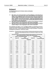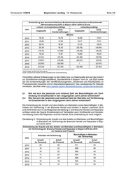 Drucksache 18/9818 Bayerischer Landtag 18. Wahlperiode Seite 2/5 Antwort des Staatsministeriums für Familie, Arbeit und Soziales vom 18.09.2020 1.1 Wie haben sich die Stundenlöhne der Beschäftigten im Einzelhandel in Bayern in den vergangenen zehn Jahren entwickelt (bitte hier und bei allen weiteren Fragen Daten für jedes Jahr einzeln nennen sowie die Angaben so weit wie möglich nach Branchen und Ort des Handels ausdifferenzieren, das heißt – bezogen auf den Ort des Handels – neben dem stationären Einzel- handel bitte u. a. auch den Internet- bzw. Onlineeinzelhandel [E-Commerce] in die Auflistung mit einbeziehen)? 1.2 Wie haben sich die Stundenlöhne der weiblichen Beschäftigten im Einzel- handel in Bayern in den vergangenen zehn Jahren entwickelt? 1.3 Wie haben sich die Stundenlöhne der männlichen Beschäftigten im Einzel- handel in Bayern in den vergangenen zehn Jahren entwickelt? Die im Rahmen der Fragen 1.1 bis 1.3 erfragten Angaben zur Entwicklung des durch- schnittlichen Bruttostundenlohns der Beschäftigten im Einzelhandel in Bayern für den Zeitraum 2010–2019 – sowohl insgesamt als auch für Frauen und Männer – können der nachfolgenden Darstellung 1 entnommen werden. Darstellung 1: Entwicklung des durchschnittlichen Bruttostundenverdienstes im Einzel- handel nach Beschäftigungsumfang und Geschlecht in Bayern 2010–2019 (in Euro) Entwicklung des durchschnittlichen Bruttostundenverdienstes im Einzelhandel (Wirtschaftszweig G47) in Bayern 2010–2019 (in Euro) vollzeit- und teilzeitbeschäftigt vollzeitbeschäftigt Jahr ohne ohne insgesamt insgesamt Sonderzahlungen Sonderzahlungen Insgesamt 2010 15,66 14,39 16,59 15,21 2011 16,01 14,72 16,97 15,56 2012 17,35 15,91 18,60 16,99 2013 17,23 15,81 18,38 16,79 2014 (16,47) (15,43) (17,74) (16,64) 2015 16,85 15,64 18,15 16,78 2016 17,86 16,52 19,38 17,85 2017 17,71 16,48 (19,30) 17,89 2018 (19,60) (17,83) (21,51) (19,38) 2019 (19,77) (18,30) (21,63) (19,91) Frauen 2010 14,24 13,11 14,62 13,43 2011 14,45 13,34 14,80 13,63 2012 15,15 13,97 15,87 14,54 2013 15,40 14,22 16,00 14,75 2014 15,06 14,11 (15,84) (14,92) 2015 15,41 14,39 16,36 15,24 2016 16,07 15,01 17,08 15,92 2017 16,24 15,13 (17,64) 16,34 2018 17,86 16,42 (19,56) (17,83) 2019 17,83 16,64 (19,33) (17,96)