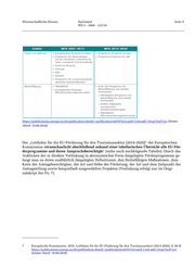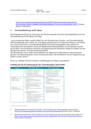 Wissenschaftliche Dienste Sachstand Seite 9 WD 5 - 3000 - 122/18 https://publications.europa.eu/de/publication-detail/-/publication/e0707433-aa5f-11e6-aab7-01aa75ed71a1 (letzter Abruf: 19.09.2018) Der „Leitfaden für die EU-Förderung für den Tourismussektor (2014-2020)“ der Europäischen Kommission veranschaulicht abschließend anhand einer tabellarischen Übersicht alle EU-För- derprogramme und deren Anspruchsberechtigte (siehe auch nachfolgende Tabelle). Durch das 7 Anklicken der in direkter Verlinkung in akronymischer Form dargelegten Förderprogramme ge- langt man zu deren ausführlich dargelegten Definitionen, den förderfähigen Maßnahmen, dem Kreis der Antragsberechtigten, der Art und Höhe der Förderung, der Art und dem Zeitpunkt der Antragstellung sowie beispielhaft ausgewählten Projekten (Verlinkung erfolgt nur im Origi- nalskript der Fn. 7). 7 Europäische Kommission, 2016, Leitfaden für die EU-Förderung für den Tourismussektor (2014-2020), S. 66 ff. https://publications.europa.eu/de/publication-detail/-/publication/e0707433-aa5f-11e6-aab7-01aa75ed71a1 (letzter Abruf: 19.09.2018)