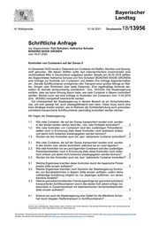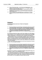 18. Wahlperiode 01.04.2021 Drucksache 18/13956 Schriftliche Anfrage der Abgeordneten Toni Schuberl, Katharina Schulze BÜNDNIS 90/DIE GRÜNEN vom 18.01.2020 Kontrollen von Containern auf der Donau II Im Dezember 2020 wurde in Österreich ein Container mit Waffen, Munition und Spreng- stoff gefunden. Mit diesen Waffen sollte laut österreichischem Innenminister eine rechtsradikale Miliz in Deutschland aufgebaut werden. Bereits am 28.05.2019 stellten die Abgeordneten Katharina Schulze und Toni Schuberl (BÜNDNIS 90/DIE GRÜNEN) eine Anfrage zur Kontrolle von Containern und leiteten ihre Anfrage folgendermaßen ein: „Gerade Schiffscontainer ermöglichen den Transport einer großen Menge an Waf- fen, Drogen oder Ähnlichem über weite Distanzen. Eine regelmäßige Kontrolle der- selben ist deshalb stichpunktartig unerlässlich.“ (Drs. 18/3434). Die Staatsregierung erklärte, dass sie keine Ahnung davon habe, wie viele Container in Bayern kontrolliert werden. Bereits zuvor war eine Anfrage zu Kontrollen von Containern vom 11.04.2019 (Drs. 18/2092) mangelhaft beantwortet worden. Die Unwissenheit der Staatsregierung in diesem Bereich ist ein Sicherheitsrisiko, das, wie sich gezeigt hat, auch staatsgefährdend sein kann. Diese muss durch eine klare Strategie ersetzt werden, wie im Rahmen der Schleierfahndung auch grenzüber- schreitend transportierte Schiffscontainer planmäßig kontrolliert werden können. Wir fragen die Staatsregierung: 1.1 Wie viele Container, die auf der Donau transportiert worden sind, wurden in den letzten beiden Jahren beim Be-, Um- oder Entladen kontrolliert? 2 1.2 Wie viele Kontrollen von Containern sind den zuständigen Polizeidienst- stellen noch in Erinnerung (falls diese Kontrollen nicht statistisch erfasst und damit nicht lückenlos wiedergegeben werden können)? 2 1.3 Wurden bei den Kontrollen auch als „leer“ deklarierte Container kontrolliert? 2 2.1 Wie viele Container, die auf der Donau transportiert worden sind, wurden in den letzten zwei Jahren kontrolliert, während sie an Land lagerten? 2 2.2 Wie viele Kontrollen von an Land lagernden Containern sind den zuständigen Polizeidienststellen noch in Erinnerung (falls diese Kontrollen nicht statis- tisch erfasst und damit nicht lückenlos wiedergegeben werden können)? 2 2.3 Wurden bei den Kontrollen auch als „leer“ deklarierte Container kontrolliert? 2 3.1 Welche Ergebnisse brachten diese Kontrollen durch die bayerische Polizei jeweils (bitte einzeln auflisten)? 3 3.2 Welche Ergebnisse brachten nach Kenntnis der Staatsregierung Kontrol- len von Bundesbehörden in Bayern (bitte einzeln auflisten, sofern keine vollständige Aufzählung möglich ist, nur diejenigen aufführen, von denen Kenntnis besteht)? 3 3.3 Welche grenzüberschreitenden Fahndungserfolge bei grenzüberschreitend transportierten Schiffscontainern sind in den letzten fünf Jahren erfolgt, ins- besondere in Zusammenarbeit mit österreichischen Sicherheitsbehörden (bitte einzeln auflisten)? 3 4.1 Erkennt nun auch die Staatsregierung eine Gefahr für die öffentliche Sicher- heit durch illegalen Waffentransport in Schiffscontainern? 3 Hinweis des Landtagsamts: Zitate werden weder inhaltlich noch formal überprüft. Die korrekte Zitierweise liegt in der Verantwortung der Fragestellerin bzw. des Fragestellers sowie der Staatsregierung. Drucksachen, Plenarprotokolle sowie die Tagesordnungen der Vollversammlung und der Ausschüsse sind im Internet unter www.bayern.landtag.de/parlament/dokumente/ abrufbar. Die aktuelle Sitzungsübersicht steht unter www.bayern.landtag.de/aktuelles/sitzungen/ zur Verfügung.
