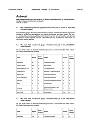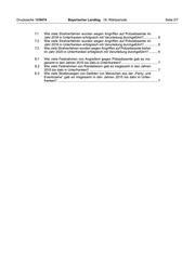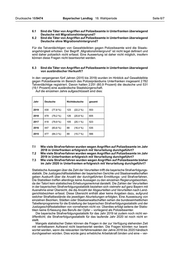 Drucksache 18/9474 Bayerischer Landtag 18. Wahlperiode Seite 7/7 fassungsrechtlich gebotene – effektive Strafverfolgung durch die Staatsanwaltschaft gefährden. Im Übrigen finden sich Angaben zu den Verurteilten in der unter https://www.statis tik.bayern.de/mam/produkte/veroffentlichungen/statistische_berichte/b6100c_201800. pdf vom Landesamt für Statistik veröffentlichten bayerischen Strafverfolgungsstatistik 2018; auch die Strafverfolgungsstatistiken für die Jahre 2013 bis 2017 sind auf der Seite des Landesamtes für Statistik veröffentlicht. 8.1 Wie viele Festnahmen von Angreifern gegen Polizeibeamte gab es insgesamt in den Jahren 2015 bis dato in Unterfranken? Im Zusammenhang mit den 3 369 seit 2015 bis einschließlich 2019 gemeldeten Fäl- len von Gewalt gegen Polizeibeamte im Regierungsbezirk Unterfranken gab es 217 vorläufige Festnahmen. 8.2 Wie viele Festnahmen von Randalierern gab es insgesamt in den Jahren 2015 bis dato in Unterfranken? Aufgrund der nicht näheren Definition eines „Randalierers“ und mangels eindeutiger Parameter lässt sich die Anzahl der Festnahmen von „Randalieren“ nicht erheben. 8.3 Wie viele Strafanzeigen von Delikten von Menschen aus der „Party- und Eventszene“ gab es insgesamt in den Jahren 2015 bis dato in Unterfranken? Bei der Personalienfeststellung von Beschuldigten werden keine Angaben zur Zuge- hörigkeit zur „Party- und Eventszene“ erhoben. Darüber hinaus gibt es keine eindeutigen Parameter in der Polizeilichen Kriminalstatistik (PKS) oder im Vorgangserfassungssystem, auf deren Grundlage sich diese Frage valide beantworten lässt.