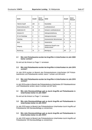 Drucksache 18/9474 Bayerischer Landtag 18. Wahlperiode Seite 5/7 4.1 Wie viele Hotspots von Menschen aus der „Party- und Eventszene“ sind der Polizei in Unterfranken bekannt? Im Bereich des Polizeipräsidiums Unterfranken sind aktuell, abgesehen von offiziellen Veranstaltungsörtlichkeiten, insbesondere neun Hotspots von Menschen aus der „Party- und Eventszene“ polizeilich bekannt. Es gilt zu berücksichtigen, dass Hotspots im Be- reich der „Party- und Eventszene“ dynamisch sind. – Würzburg: Alte Mainbrücke, Graf Luckner Weiher, Äußere Aumühlstraße, Bismarck- wäldchen – Aschaffenburg: Perth Inch – Schweinfurt: Maininsel, Am unteren Marienbach/Mainkai – Kitzingen: Bleichwasen – Lohr am Main: Mainufer mit Skaterplatz 4.2 Wie viele Fälle von Gewalt gegen Polizeibeamte gab es seit 2015 im Bereich der Bleichwasen in Kitzingen? Im Bereich der Bleichwasen in Kitzingen wurden im Zeitraum 2015 bis 2019 insgesamt zwei Fälle von Gewalt gegen Polizeibeamte gemeldet: Im Jahr 2018 ein tätlicher Angriff auf Vollstreckungsbeamte und im Jahr 2019 eine Beleidigung. 4.3 Wie viele Fälle von Gewalt gegen Polizeibeamte gab es seit 2015 im Bereich der Perth Inch in Aschaffenburg? Im Bereich der Perth Inch in Aschaffenburg wurden im Zeitraum 2015 bis 2019 insgesamt zwei Fälle von Gewalt gegen Polizeibeamte gemeldet: Im Jahr 2017 eine Körperver- letzung und im Jahr 2019 eine Beleidigung. Diese Fälle ereigneten sich im Nahbereich um den Perth Inch. 5.1 Wo findet man Schwerpunkte von Angriffen auf Polizeibeamte in Würzburg Stadt? In der kreisfreien Stadt Würzburg fanden in den vergangenen fünf Jahren die meisten Fälle von Gewalt gegen Polizeibeamte im Bereich der Innenstadt statt. 5.2 Wo findet man Schwerpunkte von Angriffen auf Polizeibeamte in Schwein- furt Stadt? In der kreisfreien Stadt Schweinfurt fanden in den vergangenen fünf Jahren ebenfalls die meisten Fälle von Gewalt gegen Polizeibeamte im Bereich der Innenstadt statt. 5.3 Wo findet man Schwerpunkte von Angriffen auf Polizeibeamte in Unter- franken? Den gesamten Regierungsbezirk Unterfranken betrachtet, weisen die kreisfreien Städte sowohl die höchsten Häufigkeitszahlen (HZ, Anzahl der Fälle bezogen auf 100 000 Einwohner) als auch die höchsten absoluten Fallzahlen auf. Zuletzt konnten 2019 in der Stadt Würzburg 116 Fälle (HZ: 91), in der Stadt Aschaffenburg 91 Fälle (HZ: 129) und in der Stadt Schweinfurt 78 Fälle (HZ: 144) gezählt werden. Die Tatörtlichkeit betreffend ereignen sich die meisten Fälle auf öffentlichen Straßen, Wegen und Plätzen. Am zweithäufigsten finden Fälle von Gewalt gegen Polizeibeamte in Privathäusern, -wohnungen oder auf privaten Grundstücken und am dritthäufigsten in Polizeidienststellen und -fahrzeugen statt.