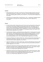 Wissenschaftliche Dienste Dokumentation Seite 12 WD 5 - 3000 - 009/17 Saarland • IHK Saarland (2015). Groll, Oliver. Saar-Exporte nach Russland gehen deutlich zurück. Ein Jahr Russland-Sanktionen. Saarbrücken. 31.07.2015. Link: http://ihksaarland.de/p/SaarEx- porte_nach_Russland_gehen_deutlich_zur%C3%BCck-17-11533.html (zuletzt aufgerufen am 31.01.2017). • Statistisches Amt Saarland (Hrsg.). Statistik-Portal. G III 1,3. Außenhandel. Halbjahresstatisti- ken. Saarbrücken. Link: http://www.saarland.de/62561.htm (zuletzt aufgerufen am 31.01.2017). Sachsen • Freistaat Sachsen (2015). Staatministerium für Umwelt und Landwirtschaft. Der Staatsminis- ter. Antwort auf die Kleine Anfrage des Abgeordneten Jörg Urban, AfD-Fraktion, Drs.-Nr. 6/2836, Thema: Wirtschaftliche Schädigung der Sächsischen Land- und Ernährungswirt- schaft durch das Russland-Embargo der EU. Magdeburg. 12.10.2015. Link: http://edas.land- tag.sachsen.de/viewer.aspx?dok_nr=2836&dok_art=Drs&leg_per=6&pos_dok=1&dok_id=un- defined (zuletzt aufgerufen am 31.01.2017). • Die Sächsischen Industrie- und Handelskammern (Hrsg.) (2016). „Positionspapier der sächsi- schen Industrie- und Handelskammern zu den EU-Sanktionen gegen Russland“. 15. Februar 2016. Link: https://www.chemnitz.ihk24.de/blob/cihk24/servicemarken/presse/Pressear- chiv_216/IHK-Chemnitz/3150672/9f243f5ec0982ae25b5e394c77f43b36/Positionspa- pier_Russlandsanktionen--LAG--15-02_16-data.pdf (zuletzt aufgerufen am 31.01.2017). • Sachsen.de, Medienservice Sachsen (2016). News. Sachsens Maschinenbau kämpft gegen Ab- satzeinbußen in Russland. 19.05.2016. Link: https://www.medienservice.sachsen.de/me- dien/news/203752 (zuletzt aufgerufen am 31.01.2017). • Sachsen.de, Medienservice Sachsen (2016). News. Sachsens Wirtschaft legt im Export wieder kräftig zu. 03.03.2016. Link: https://www.medienservice.sachsen.de/medien/news/202372 (zuletzt aufgerufen am 31.01.2017). • Statistisches Landesamt des Freistaates Sachsen (Hrsg.) (2016). Statistischer Bericht. Außen- handel des Freistaates Sachsen. Endgültige Ergebnisse 2015. G III 2 – j/15. Kamenz. Dezem- ber 2016. Link: https://www.statistik.sachsen.de/download/100_Berichte- G/G_III_2j_15_SN.pdf (zuletzt aufgerufen am 31.01.2017). • Statistisches Landesamt des Freistaates Sachsen (Hrsg.) (2016). Statistischer Bericht. Außen- handel des Freistaates Sachsen. Endgültige Ergebnisse 2014. G III 2 – j/14. Kamenz. Novem- ber 2015. Link: https://www.statistik.sachsen.de/download/100_Berichte- G/G_III_2j_14_SN.pdf (zuletzt aufgerufen am 31.01.2017).