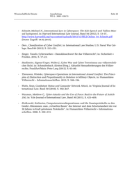 Wissenschaftliche Dienste Ausarbeitung Seite 20 WD 2 - 3000 - 038/15 - Schmitt, Michael N., International Law in Cyberspace: The Koh Speech and Tallinn Man- ual Juxtaposed, in: Harvard International Law Journal, Band 54 (2012), S. 13–37, http://www.harvardilj.org/wp-content/uploads/2012/12/HILJ-Online_54_Schmitt.pdf (letzter Zugriff: 18.02.2015). - Ders., Classification of Cyber Conflict, in: International Law Studies, U.S. Naval War Col- lege, Band 89 (2013), S. 233–251. - Singer, Tassilo, Cyberwarfare – Damoklesschwert für das Völkerrecht?, in: Sicherheit + Frieden, 2014, S. 17–23. - Stadlmeier, Sigmar/Unger, Walter J., Cyber War und Cyber Terrorismus aus völkerrechtli- cher Sicht, in: Schmalenbach, Kirsten (Hrsg.), Aktuelle Herausforderungen des Völker- rechts, Frankfurt/Main: Peter Lang (2012), S. 63–80. - Theeuwen, Wieteke, Cyberspace Operations in International Armed Conflict: The Princi- ples of Distinction and Proportionality in Relation to Military Objects, in: Humanitäres Völkerrecht – Informationsschriften, 2013, S. 188–194. - Watts, Sean, Combatant Status and Computer Network Attack, in: Virginia Journal of In- ternational Law, Band 50 (2010), S. 392–447. - Waxman, Matthew C., Cyber-Attacks and the Use of Force: Back to the Future of Article 2(4), in: Yale Journal of International Law, Band 36 (2011), S. 421–459. - Ziolkowski, Katharina, Computernetzwerkoperationen und die Zusatzprotokolle zu den Genfer Abkommen: zum „virtuellen Raum“ des Internet und dem Schutzstandard der vor 30 Jahren in Kraft getretenen Protokolle“, in: Humanitäres Völkerrecht – Informations- schriften, 2008, S. 202–213.