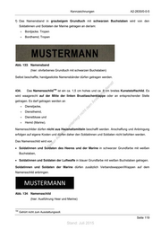 Kennzeichnungen A2-2630/0-0-5 f) Das Namensband in graubeigem Grundtuch mit schwarzen Buchstaben wird von den Soldatinnen und Soldaten der Marine getragen an der/am: + Bordjacke. Tropen + Bordhemd, Tropen Abb. 133: Namensband (hier: olivfarbenes Grundtuch mit schwarzen Buchstaben) Selbst beschaffte, handgestickte Namensbänder dürfen getragen werden. ! st ie n 434. Das Namensschild 194 ist ein ca. 1,5 cm hohes und ca. 8 cm breites Kunststoffschild. Es ru ng sd wird waagerecht auf der Mitte der linken Brusttaschenklappe oder an entsprechender Stelle de getragen. Es darf getragen werden an Än + Dienstjacke, em ht + Diensthemd, d ni c + Dienstbluse und eg t + Hemd (Marine). rli unte Namensschilder dürfen nicht aus Haushaltsmitteln beschafft werden. Anschaffung und Anbringung ck dr erfolgen auf eigene Kosten und dürfen daher den Soldatinnen und Soldaten nicht befohlen werden. us u rA Das Namensschild wird von iese • Soldatinnen und Soldaten des Heeres und der Marine in schwarzer Grundfarbe mit weißen D Buchstaben, • Soldatinnen und Soldaten der Luftwaffe in blauer Grundfarbe mit weißen Buchstaben getragen. Soldatinnen und Soldaten der Marine dürfen zusätzlich Verbandswappen/Wappen auf dem Namensschild anbringen. Abb. 134: Namensschild (hier: Ausführung Heer und Marine) 194 Gehört nicht zum Ausstattungssoll. Seite 119 Stand: Juli 2015