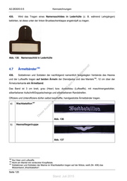A2-2630/0-0-5 Kennzeichnungen 435. Wird das Tragen eines Namensschildes in Lederhülle (z. B. während Lehrgängen) befohlen, ist diese unter der linken Brusttaschenklappe angeknöpft zu tragen. Abb. 135: Namensschild in Lederhülle ! st 195 ie 4.7 Ärmelbänder n ru ng 436. sd Soldatinnen und Soldaten der nachfolgend namentlich festgelegten Verbände des Heeres de 196 und der Luftwaffe tragen auf beiden Ärmeln der Dienstjacke und des Mantels Än , 12 cm über der Ärmelunterkante ein Ärmelband. em ht d Das Band ist 3 cm breit, grau (Heer) bzw. dunkelblau (Luftwaffe), mit maschinengestickter, ni c silberfarbener Aufschrift/Doppelschwinge und silberfarbenen Randstreifen. eg rli t Offiziere und Unteroffiziere dürfen selbst beschaffte, handgestickte Ärmelbänder tragen. unte a) Wachbataillon 197 ck dr u us rA iese D Abb. 136 b) Heeresfliegertruppe Abb. 137 195 Nur Heer und Luftwaffe. 196 Nicht am Mantel mit verdeckter Knopfleiste. 197 Soldatinnen und Soldaten der Marine im Wachbataillon tragen auf der Mütze, weiß (Nr. 406) das Mützenband „Wachbataillon“. Seite 120 Stand: Juli 2015