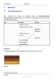 A2-2630/0-0-5 Abzeichen 5 Abzeichen 5.1 Nationalitätsabzeichen 501. Soldatinnen und Soldaten der Bundeswehr tragen das Nationalitätsabzeichen Bundesrepublik Deutschland waagerecht, 6 cm unter der Ärmeleinsatznaht, auf beiden Oberärmeln folgender Bekleidungsstücke: Heer Luftwaffe Marine Feldjacke, Tarndruck Nässeschutzjacke, Tarndruck Bordparka ! st ie n ru Bordjacke ng sd Feldbluse, Tarndruck de 198 Än Pullover em ht d Bordhemd ni c Panzerkombinationeg t Fliegerlederjacke rli unte Fliegerkombination ck dr u us rA Ausführung: iese Gewebtes Baumwollband in den Bundesfarben Schwarz-Rot-Gold. Größe 5 x 2,5 cm. D Abb. 145 198 Nicht am Pullover, grau (Heer). Seite 122 Stand: Juli 2015
