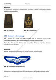 A2-2630/0-0-5 Abzeichen Ausführung: In die olivfarbene Dienstgrad-Aufschiebeschlaufe eingewebte, stilisierte, schwarze (für Generale goldfarbene) Doppelschwinge. ! st Abb. 147: Feldwebel Abb. 148: Generalleutnant ie n ru ng sd de Än 5.2.2 Abzeichen am Dienstanzug em 504. ht Soldaten der Luftwaffe tragen auf der rechten Seite der Dienstjacke, 1 cm über der d ni c Oberkante der Brusttasche, das Teilstreitkraftabzeichen Luftwaffe (Doppelschwinge). eg t Dieses Abzeichen ist beim rli Erwerb eines an gleicher Stelle zu tragenden, deutschen unte Tätigkeitsabzeichens abzulegen. ck dr u us rA Ausführung: iese Stilisierte, silberfarbene Doppelschwinge auf blauem Grundtuch, maschinengestickt. D Abb. 149: Allgemeines Luftwaffenabzeichen Selbstbeschaffte handgestickte Abzeichen dürfen an selbstbeschafften Dienstjacken getragen werden. Seite 124 Stand: Juli 2015