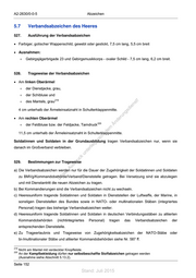 A2-2630/0-0-5 Abzeichen 5.7 Verbandsabzeichen des Heeres 527. Ausführung der Verbandsabzeichen • Farbiger, gotischer Wappenschild, gewebt oder gestickt, 7,5 cm lang, 5,5 cm breit • Ausnahmen: + Gebirgsjägerbrigade 23 und Gebirgsmusikkorps - ovaler Schild - 7,5 cm lang, 6,2 cm breit. 528. Trageweise der Verbandsabzeichen • Am linken Oberärmel + der Dienstjacke, grau, + der Schibluse und 219 + des Mantels, grau ! st ie n 4 cm unterhalb der Ärmeleinsatznaht in Schulterklappenmitte. ru ng sd • Am rechten Oberärmel de + der Feldbluse bzw. der Feldjacke, Tarndruck 220 Än em 11,5 cm unterhalb der Ärmeleinsatznaht in Schulterklappenmitte. ht d ni c Soldatinnen und Soldaten in der Grundausbildung tragen Verbandsabzeichen nur, wenn sie eg t danach im Großverband verbleiben. rli unte ck 529. Bestimmungen zur Trageweise dr u us rA a) Die Verbandsabzeichen werden nur für die Dauer der Zugehörigkeit der Soldatinnen und Soldaten iese zu BMVg/Kommandobehörde/Verband/Dienststelle getragen. Bei Versetzung sind sie abzulegen D und mit Dienstantritt die neuen Abzeichen zu tragen. b) Bei Kommandierungen sind die Verbandsabzeichen nicht zu wechseln. c) Heeresuniform tragende Soldatinnen und Soldaten in Dienststellen der Luftwaffe, der Marine, in sonstigen Dienststellen des Bundes sowie in NATO- oder multinationalen Stäben (integriertes Personal) tragen das bisherige Verbandsabzeichen weiter. d) Heeresuniform tragende Soldatinnen und Soldaten in deutschen Verbindungsstäben zu alliierten Kommandobehörden (nichtintegriertes Personal) tragen das Verbandsabzeichen der entsprechenden Dienststelle. e) Zu Trageerlaubnis und Trageweise von Zugehörigkeitsabzeichen der NATO-Stäbe oder bi-/multinationaler Stäbe und alliierter Kommandobehörden siehe Nr. 587 ff. 219 Nicht am Mantel mit verdeckter Knopfleiste. 220 An der Kampfbekleidung dürfen nur selbstbeschaffte Stoffabzeichen getragen werden (Ausnahme siehe Abschnitt 5.13.2). Seite 152 Stand: Juli 2015
