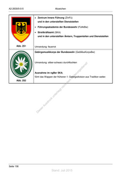 A2-2630/0-0-5 Abzeichen Planungsamt der Bundeswehr (PlgABw) Umrandung: silber-schwarz durchflochten Abb. 244 • Einsatzführungskommando der Bundeswehr (EinsFüKdoBw) und in den unterstellten Dienststellen • Bundesamt für Personalmanagement (BAPersBw) und in allen weiteren Dienststellen im Organisationsbereich Personal ! st ie n • Bundesamt für Ausrüstung, Informationstechnik und Nutzung ru ng sd (BAAINBw) und in den unterstellten Dienststellen de Abb. 245 • Bundesamt für Infrastruktur, Umweltschutz und Dienstleistungen Än em (BAIUDBw) und in den unterstellten Dienststellen ht d • Kommando Streitkräftebasis (KdoSKB) ni c Umrandung: eg t gold-schwarz • Luftfahrtamt der Bundeswehr (LufABw) rli unte durchflochten • Amt für den Militärischen Abschirmdienst (MAD) ck dr u • Amt für Militärkunde (AMK) us Hinterlegung: rA • Bundesakademie für Sicherheitspolitik (BAKS) ie feuerrot se D • Deutscher Militärischer Vertreter im Militärausschuss der NATO, bei der Europäischen Union und der Westeuropäischen Union und in den unterstellten Deutschen Anteilen bei Dienststellen der NATO und der Europäischen Union Multinationales Kommando Operative Führung (MN KdoOpFü) Umrandung: gold-schwarz durchflochten Abb. 246 Seite 154 Stand: Juli 2015