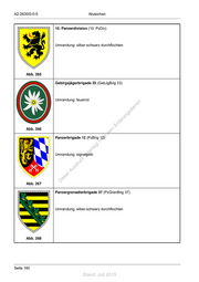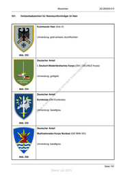 Abzeichen A2-2630/0-0-5 531. Verbandsabzeichen für Heeresuniformträger im Heer Kommando Heer (Kdo H) Umrandung: gold-schwarz durchflochten Abb. 253 Deutscher Anteil ! st I. Deutsch-Niederländisches Korps (DtA I. DEU/NLD Korps) ie n ru ng sd Umrandung: goldgelb de Än em ht d ni c Abb. 254 eg rli t Deutscher Anteil unte Eurokorps (DtA Eurokorps) ck dr u us rA ie Umrandung: basaltgrau se D Abb. 255 Deutscher Anteil Multinationales Korps Nordost (DtA MNK NO) Umrandung: basaltgrau Abb. 256 Seite 157 Stand: Juli 2015