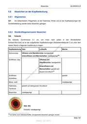 Abzeichen A2-2630/0-0-5 5.9 Abzeichen an der Kopfbedeckung 5.9.1 Allgemeines 537. Am Gefechtshelm; Fliegerhelm; an der Feldmütze, Winter und an den Kopfbedeckungen der Sonderbekleidung werden keine Abzeichen getragen. 5.9.2 Streitkräftegemeinsame Abzeichen 538. Kokarde Die Kokarde, Durchmesser 2,1 cm, von innen nach außen in den Bundesfarben Schwarz-Rot-Gold, ist an den aufgeführten Kopfbedeckungen (Kokardenmittelpunkt 3 cm unter dem oberen Rand) in folgender Ausführung zu tragen: ! st ie n Kopfbedeckung Heer Luftwaffe ru ng Marine sd Schirmmütze Offiziere und Oberfähnriche: handgestickt; de Än Unteroffiziere und Mannschaften: metallgeprägt 226 em Schiffchen, blau ht Offiziere und d ni Oberfähnriche: handgestickt; c eg t rli Unteroffiziere und unte Mannschaften: gewebt auf ck 226 dr u blauem Grundtuch us Schiffchen, rA gewebt ie dunkelblau se D Mütze, weiß metallgeprägt Feldmütze, gewebt auf steingrauem Grundtuch Tarndruck Bergmütze metallgeprägt Abb. 283 Kokarde, metallgeprägt 226 Es dürfen auch selbstbeschaffte, handgestickte Abzeichen getragen werden. Seite 167 Stand: Juli 2015