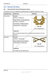 A2-2630/0-0-5 Abzeichen 5.9.3 Abzeichen des Heeres 539. Gekreuzte Säbel mit/ohne Eichenlaubumrandung Die Abzeichen sind an den aufgeführten Kopfbedeckungen in folgender Ausführung zu tragen: Kopfbedeckung Ausführung Abbildung Schirmmütze Generale: goldfarben, handgestickt; Übrige Offiziere und Oberfähnriche: silberfarben, handgestickt; Unteroffiziere und Mannschaften: hellaltgoldfarben, metallgeprägt. ! Abb. 284 st ie n (hier: hellaltgoldfarben) ru ng Trageweise: sd de Än Über der Mitte des Mützenschirms, Unterkante des Abzeichens über dem em Kinnband. ht d Bergmütze Generale: ni c eg t goldfarben, metallgeprägt; rli unte Übrige Soldatinnen und Soldaten: ck hellaltgoldfarben, metallgeprägt. dr u us Abb. 285 rA iese (hier: hellaltgoldfarben) D Trageweise: In der Mitte über dem Mützenschirm. Seite 168 Stand: Juli 2015
