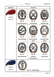 Abzeichen A2-2630/0-0-5 Barettfarbe Abzeichen Abb. 300 Korallenrot Abb. 301 Abb. 302 Abb. 303 ABC-Abwehrtruppe Artillerietruppe Feldjägertruppe ! st ie n ru ng sd de Än em Abb. 304 ht d Abb. 305 Abb. 306 ni c Fernmeldetruppe eg Geoinformations- Instandsetzungs- t rli dienst truppe unte ck dr u us rA iese D Abb. 307 Abb. 308 Abb. 309 Nachschubtruppe Operative Pioniertruppe Kommunikation Abb. 310 Kobaltblau Abb. 311: Sanitätstruppe Seite 171 Stand: Juli 2015