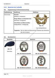 A2-2630/0-0-5 Abzeichen 5.9.4 Abzeichen der Luftwaffe 542. Doppelschwinge mit Eichenlaubumrandung Kopfbedeckung Ausführung Abbildung Schirmmütze Generale: goldfarben, handgestickt; Übrige Offiziere und Oberfähnriche: silberfarben, handgestickt; Unteroffiziere und Mannschaften: hellaltgoldfarben, metallgeprägt. Abb. 318 (hier: hellaltgoldfarben) ! st ie n Trageweise: Über der Mitte des Mützenschirms, Unterkante des Abzeichens ru ng über dem Kinnband. sd de Än em 543. Barettabzeichen ht d ni c Barettfarbe Abzeichen eg t rli unte ck dr u us rA Abb. 319 iese D Marineblau Abb. 320:Objektschutzkräfte Abb. 321:Wachbataillon Abb. 322:Militärmusikdienst Abb. 323:Sanitätstruppe Seite 176 Stand: Juli 2015