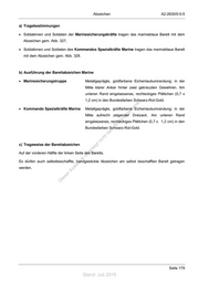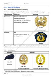 Abzeichen A2-2630/0-0-5 a) Tragebestimmungen • Soldatinnen und Soldaten der Marinesicherungskräfte tragen das marineblaue Barett mit dem Abzeichen gem. Abb. 327; • Soldatinnen und Soldaten des Kommandos Spezialkräfte Marine tragen das marineblaue Barett mit dem Abzeichen gem. Abb. 328. b) Ausführung der Barettabzeichen Marine • Marinesicherungstruppe Metallgeprägte, goldfarbene Eichenlaubumrandung; in der Mitte klarer Anker hinter zwei gekreuzten Gewehren. Am unteren Rand eingelassenes, rechteckiges Plättchen (0,7 x 1,2 cm) in den Bundesfarben Schwarz-Rot-Gold. ! st ie • Kommando Spezialkräfte Marine Metallgeprägte, goldfarbene Eichenlaubumrandung; in der n ru ng Mitte aufrecht zeigender Dreizack. Am unteren Rand sd eingelassenes, rechteckiges Plättchen (0,7 x 1,2 cm) in den de Än Bundesfarben Schwarz-Rot-Gold. em ht d ni c c) Trageweise der Barettabzeichen eg rli t Auf der vorderen Hälfte der linken Seite des Baretts. unte ck Es dürfen auch selbstbeschaffte, handgestickte Abzeichen am selbst beschafften Barett getragen dr u werden. us rA iese D Seite 179 Stand: Juli 2015