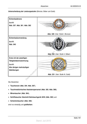 Abzeichen A2-2630/0-0-5 Unterscheidung der Leistungsstufen (Bronze, Silber und Gold) Eichenlaubkranz Betrifft: Abb. 357, Abb. 361, Abb. 362 Abb. 329 (hier: Stufe I, Bronze) Eichenlaubumrandung Betrifft: Abb. 340 ! st ie n ru ng sd de Abb. 330 (hier: Stufe II, Silber) Än Kreis mit der jeweiligen em ht d Tätigkeitskennzeichnung ni c Betrifft: eg t rli Alle übrigen mehrstufigen unte Abbildungen ck dr u us Abb. 331 (hier: Stufe III, Gold) rA iese D Die Abzeichen • Taucherarzt (Abb. 354, Abb. 367), • Tauchmedizinisches Assistenzpersonal (Abb. 355, Abb. 368), • Minentaucher (Abb. 364), • Schiffstaucher Atemluft-Helmtauchgerät AHG (Abb. 365) und • Schwimmtaucher (Abb. 366) sind nur einstufig und goldfarben. Seite 181 Stand: Juli 2015