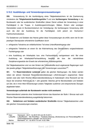 A2-2630/0-0-5 Abzeichen 5.10.2 Ausbildungs- und Verwendungsvoraussetzungen 550. Voraussetzung für die Aushändigung eines Tätigkeitsabzeichens ist die Zuerkennung mindestens der Tätigkeitsstufe/Ausbildungshöhe 7 und eine fachbezogene Verwendung in der Bundeswehr oder bei ausländischen Streitkräften (dieser Dienst umfasst die Verwendung in einer Fachtätigkeit in der Truppe, in Ausbildungseinrichtungen, Stäben, Ämtern oder sonstigen Dienststellen sowie im Bundesministerium der Verteidigung). Als fachbezogene Verwendung zählt auch die Zeit der Ausbildung für die Fachtätigkeit, nicht jedoch ein Hochschul-/ Fachhochschulstudium. Für Soldatinnen und Soldaten des Heeres gelten diese Voraussetzungen als erfüllt, wenn die für den jeweiligen Dienstposten erforderliche Qualifikation durch • erfolgreiche Teilnahme am militärfachlichen Teil eines Unteroffizierlehrgangs oder ! st • erfolgreiche Teilnahme an einem für die Wahrnehmung des Dienstpostens vorgeschriebenen ie n Fachlehrgangs oder ru ng sd • eine Ausbildung am Arbeitsplatz bzw. eine Fachausbildung nachgewiesen wird. Bei einer de Ausbildung am Arbeitsplatz/Fachausbildung Än bestätigt die bzw. der nächsthöhere em Disziplinarvorgesetzte den Erwerb der erforderlichen Ausbildungshöhe. ht d ni Die Tätigkeitsabzeichen sind von den Ämtern der Teilstreitkräfte durch ergänzende Regelungen nach c eg 232 den jeweils gültigen Tätigkeitsklassifizierungen den Verwendungen zuzuordnen rli t . unte 551. Für Reservistendienst Leistende gelten die gleichen Bedingungen. Als Zeiten werden ck neben der aktiven Dienstzeit Reservistendienstleistungen („Wehrübungen“) angerechnet. Dabei dr u us werden zwei oder mehr Wochen Reservistendienstleistung im Kalenderjahr ohne Rücksicht auf die rA Dauer der einzelnen Wehrübung als 1 Jahr gewertet. Gleiches gilt für Berufssoldaten und Soldaten iese auf Zeit, die in ihren Mob-Verwendungen andere Tätigkeiten ausführen und entsprechende Übungen D abgeleistet haben. Verwendungen außerhalb der Bundeswehr werden nicht anerkannt. Reservistendienst Leistende ohne Vordienstzeit können das Abzeichen der Stufe I / Bronze nach acht Wochen Reservistendienstleistung ausgehändigt bekommen. 552. Soldatinnen und Soldaten ausländischer Streitkräfte können Tätigkeitsabzeichen unter den gleichen Voraussetzungen erwerben. 232 Heer: Heeresamt - Abt II - Az 49-01-00 vom 05.10.2011; Luftwaffe: Luftwaffenamt - Abt POCARLw - Fachliche Weisung „Strukturierung von Personalbegriffen im Uniformträgerbereich Luftwaffe“ vom 05.03.2012; Marine: Marineamt - A1 - Az 49-01-70 vom 14.02.1994. Seite 182 Stand: Juli 2015