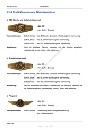 A2-2630/0-0-5 Abzeichen 5.10.4 Streitkräftegemeinsame Tätigkeitsabzeichen a) ABC-Abwehr- und Selbstschutzpersonal Abb. 332 (hier: Stufe I, Bronze) Voraussetzungen: Stufe I, Bronze: Nach 6 Monaten Dienstzeit in fachbezogener Verwendung. Stufe II, Silber: Nach 5 Jahren fachbezogener Verwendung. Stufe III, Gold: Nach 10 Jahren fachbezogener Verwendung. Ausführung: Kreis mit stilisierter Retorte, beidseitig mit vier Streifen eingefasst, ! st ie n metallgeprägt; bronze-, silber- oder goldfarben. ru ng sd de b) Brandschutzpersonal Än em ht d Abb. 333 ni c eg (hier: Stufe I, Bronze) rli t unte Voraussetzungen: Stufe I, Bronze: Nach 6 Monaten Dienstzeit in fachbezogener Verwendung. ck dr u Stufe II, Silber: us Nach 5 Jahren fachbezogener Verwendung. rA ie Stufe III, Gold: se Nach 10 Jahren fachbezogener Verwendung. D Ausführung: Kreis mit stilisiertem Schutzhelm, Feuerwehrbeil und Strahlrohr, beidseitig mit vier Streifen eingefasst, metallgeprägt; bronze-, silber- oder goldfarben. c) Fliegerarzt Abb. 334 (hier: Stufe I, Bronze) Voraussetzungen: Stufe I, Bronze: Zuerkennung der Fachtätigkeitsbenennung „Arzt Luftfahrtmedizin“. Seite 184 Stand: Juli 2015