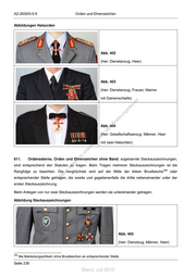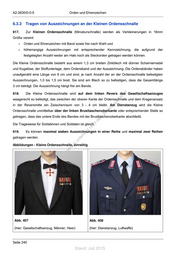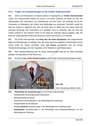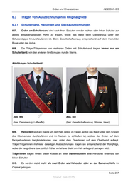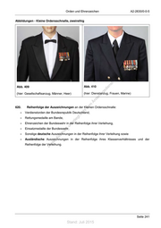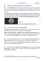 A2-2630/0-0-5 Orden und Ehrenzeichen Abbildungen zur Bandschnalle Abb. 412 (hier: Dienstanzug, Männer, Heer) Maximal zulässige Anzahl der an der Bandschnalle tragbaren Auszeichnungen. ! st ie n ru ng sd de Än em ht d ni c Abb. 413 eg t rli un (hier: Dienstanzug, Männer, Heer) te ck dr u us rA Trageweise bei unvollständigen Reihen. So steht z.B. die iese fünfte Auszeichnung unter der ersten usw. D Abb. 414 (hier: Dienstanzug, Frauen, Heer) Trageweise der Bandschnalle bei Dienstjacken ohne Brusttaschen. Seite 244 Stand: Juli 2015