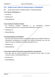 A2-2630/0-0-5 Orden und Ehrenzeichen 6.3.4 Anlässe für das Tragen der Auszeichnungen in Originalgröße 621. Auszeichnungen werden zu folgenden Anlässen in Originalgröße getragen. a) Am Tage der Aushändigung am: • Dienstanzug, • Kampfanzug und • Gesellschaftsanzug. b) Aus besonderen dienstlichen Anlässen Auf Anordnung eines/einer Vorgesetzten in der Dienststellung eines/einer Divisionskommandeurs(in) oder in entsprechender Dienststellung an aufwärts am: ! st • Dienstanzug und ie n ru ng • Gesellschaftsanzug. sd de Än em c) Bei Staatsempfängen und Staatsakten ht d Wenn auch zivile Teilnehmer die Orden in Originalgröße anlegen sowie bei offizieller Teilnahme an ni c internationalen Veranstaltungen von politischer oder militärischer Bedeutung, wenn dazu das eg t rli Anlegen der Orden in Originalgröße internationale Gepflogenheit ist, am: unte • Dienstanzug und ck dr u • Gesellschaftsanzug. us rA iese D d) Aus privaten Anlässen bei besonderen gesellschaftlichen Veranstaltungen Wenn dabei neben der Uniform ausdrücklich Frack angeordnet und das Tragen von Orden erwünscht ist sowie zu Hochzeitsfeierlichkeiten, am: • Dienstanzug und • Gesellschaftsanzug. Seite 242 Stand: Juli 2015