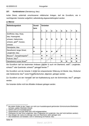 Anzugarten A2-2630/0-0-5 236. Abwandlungen der Grundform (Dienstanzug, blau) Luftwaffe Besonderheiten zur Trageweise Männer Frauen Männer Frauen 82 83 A1 Schirmmütze, blau , Barett, marineblau Nicht in Verbindung mit Pullover, blau. 84 84 A2 Blouson , Ganzjahresjacke Der Reißverschluss des Blousons bzw. der Ganzjahresjacke ist mindestens 3/4 zu schließen. Der Kragen des Blousons ist aufliegend zu tragen. Beachte Nr. 211. A3 Diensthemd, Dienstbluse, langer mit Schulterklappen langer Ärmel; Ärmel; Langbinder, blau Langbinder oder 84 Winkel , blau A4 Diensthemd, Dienstbluse, ! st 85,86 85,86 kurzer Ärmel kurzer Ärmel ie n A5 Rock, blau ru ng 84,87 sd A6 Oberhemd, Bluse, weiß de 84,87 weiß Än A7 Langbinder, schwarz 84,88 em 84, 89 ht A8 Winkel, schwarz d ni c 84,88 A9 Querbinder, schwarz eg t 84,89 A10 Winkel, schwarz rli unte A11 Wollsocken ck dr u us rA iese D 82 Gehört nicht zum Ausstattungssoll. 83 Siehe Nr. 543. 84 Gehört nicht zum Ausstattungssoll. 85 Nur bei warmer Witterung. 86 Wahlweise mit oder ohne Langbinder, blau oder (nur für Frauen), Winkel blau (Trageweise mit Langbinder, blau oder Winkel, blau darf nicht befohlen werden). 87 Das Ablegen der Jacke ist untersagt, wenn ein Oberhemd, weiß/eine Bluse, weiß, getragen wird. 88 Nur in Verbindung mit Oberhemd, weiß /Bluse, weiß. 89 Nur in Verbindung mit Bluse, weiß. Seite 45 Stand: Juli 2015
