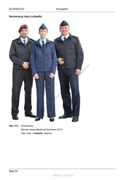 A2-2630/0-0-5 Anzugarten Dienstanzug, blau (Luftwaffe) ! st ie n ru ng sd de Än em ht d ni c eg t rli unte ck dr u us rA iese D Abb. 37a: Abwandlung Blouson (neues Modell ab Dezember 2013) (hier: Heer - Luftwaffe - Marine) Seite 52 Stand: Juli 2015