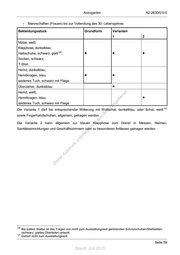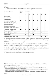 A2-2630/0-0-5 Anzugarten b) Frauen + Offiziere, Unteroffiziere, Mannschaften nach Vollendung des 30. Lebensjahres Bekleidungsstück Grund- Varianten form 1 2 3 4 5 6 Schirmmütze; Hose, dunkelblau; Gürtel, schwarz; 120 • • • • • • • Schuhe, schwarz, glatt ; Strümpfe oder Strumpfhose, hautfarben/schwarz Dienstjacke, dunkelblau • Dienstbluse, weiß, langer Ärmel; ! st Langbinder, schwarz oder • 122 • • • ie n • Winkel, schwarz 121 ru ng sd Blouson/Ganzjahresjacke 121 • • de • Pullover, blau 123 • Än • em Dienstbluse, weiß, kurzer Ärmel 124 ht • • d Die Grundform darf bei bestimmten Anlässen (Kapitel 3) auch mit Bluse, weiß, mit verdeckter ni c 121 eg 121 121 Knopfleiste , Langbinder, schwarz, Querbinder, schwarz t oder mit Winkel, schwarz getragen rli 125 werden. unte ck Die Grundform und die Variante 3 dürfen bei entsprechender Witterung mit Mantel, dunkelblau, dr u 121 Wollschal, dunkelblau, oder Schal, weiß us sowie Fingerhandschuhen, allgemein, getragen werden. rA Die Grundform und die Varianten dürfen statt mit Hose, dunkelblau, auch mit Rock, dunkelblau in iese Kombination mit Strümpfen/Strumpfhose, hautfarben getragen werden. D Die Varianten dürfen nicht bei offiziellen Anlässen getragen werden. 120 Bei kaltem Wetter ist das Tragen von nicht zum Ausstattungssoll gehörenden Schnürschuhen/Stiefeletten (schwarz, glattes Oberleder) erlaubt. 121 Gehört nicht zum Ausstattungssoll. 122 Ist der Dienstanzug in der Grundform befohlen, darf hierzu nicht der Winkel, schwarz getragen werden. 123 Soweit Brauch und gute Sitten nicht entgegenstehen. 124 Wahlweise mit oder ohne Langbinder, schwarz oder Winkel, schwarz (Trageweise mit Langbinder, schwarz oder mit Winkel, schwarz darf nicht befohlen werden). 125 Das Ablegen der Jacke ist untersagt, wenn eine Bluse, weiß, mit verdeckter Knopfleiste, getragen wird. Seite 58 Stand: Juli 2015