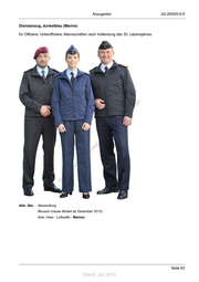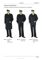Anzugarten A2-2630/0-0-5 Dienstanzug, dunkelblau (Marine) für Offiziere, Unteroffiziere, Mannschaften nach Vollendung des 30. Lebensjahres ! st ie n ru ng sd de Än em ht d ni c eg t rli unte ck dr u us rA iese D Abb. 41: mit Ergänzung: Abb. 42: mit Abwandlung: Abb. 43: mit Abwandlung: - Mantel, - Blouson (A2) - Ganzjahresjacke dunkelblau (E2) (A2) Seite 61 Stand: Juli 2015