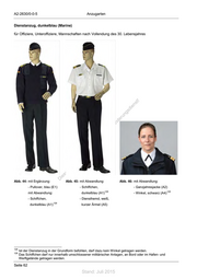 A2-2630/0-0-5 Anzugarten Dienstanzug, dunkelblau (Marine) für Offiziere, Unteroffiziere, Mannschaften nach Vollendung des 30. Lebensjahres st! ie n ru ng sd de Än em ht d ni c eg t rli unte ck dr u us rA iese Abb. 44: mit Ergänzung: D Abb. 45: mit Abwandlung: Abb. 46: mit Abwandlung: - Pullover, blau (E1) - Schiffchen, - Ganzjahresjacke (A2) 129 128 mit Abwandlung: dunkelblau (A1) - Winkel, schwarz (A4) - Schiffchen, - Diensthemd, weiß, 129 dunkelblau (A1) kurzer Ärmel (A5) 128 Ist der Dienstanzug in der Grundform befohlen, darf dazu kein Winkel getragen werden. 129 Das Schiffchen darf nur innerhalb umschlossener militärischer Anlagen, an Bord oder im Hafen- und Werftgelände getragen werden. Seite 62 Stand: Juli 2015