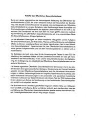 Pakt für den Öffentlichen Gesundheitsdienst Bund und Länder unterstreichen die herausragende Bedeutung des Öffentlichen Ge- sundheitsdienstes (ÖGD) für einen wirksamen Schutz der Gesundheit der Bevölke- rung. Die aktuelle Corona-Pandemie hat gezeigt, wie wichtig gerade der Öffentliche Gesundheitsdienst ist, um eine Schadens- oder Gefahrenlage dieses Ausmaßes und ihre Auswirkungen auf alle Bereiche des täglichen Lebens wirksam in den Griff zu be- kommen. Die Corona-Krise hat aber auch allen vor Augen geführt, dass eine nachhal- tige Verstärkung des Öffentlichen Gesundheitsdienstes als eine unverzichtbare Säule des Gesundheitswesens dringend geboten ist. Um die aktuellen Erfahrungen aus dieser Pandemie aufzugreifen und die Aufgaben des Gesundheitsschutzes, der Prävention, Planung und Koordinierung noch effektiver erfüllen zu können, vereinbaren Bund und Länder hiermit einen „Pakt für den Öffentli- chen Gesundheitsdienst“. Dieser hat das Ziel, den Öffentlichen Gesundheitsdienst in seiner ganzen Aufgabenvielfalt und auf allen Verwaltungsebenen zu stärken und zu modernisieren. Die Beteiligten sind sich einig, dass für die Umsetzung des Paktes für den ÖGD die Mitwirkung der kreisfreien Städte und der Landkreise wesentlich ist. Dies gilt insbe- sondere für den Personalaufbau in den unteren Gesundheitsbehörden, die Digitalisie- rung, für die Steigerung der Attraktivität des Öffentlichen Gesundheitsdienstes und das geplante Monitoring. Der föderal organisierte Öffentliche Gesundheitsdienst in den Ländern hat in den letz- ten Monaten einen ganz wesentlichen Beitrag zur Eindämmung der Corona-Pandemie geleistet. Um den Öffentlichen Gesundheitsdienst auch für die weiteren Herausforde- rungen zu stärken, haben einige Länder im Vorgriff auf den Pakt schon kurzfristig sehr rasch bedeutende Verbesserungen in der personellen und apparativen Ausstattung veranlasst. Aufbauend auf diesen Strukturen soll mit dem Pakt der ÖGD insbesondere in den Ländern zum Schutz der Bevölkerung vor den bestehenden Gesundheitsgefah- ren gestärkt und ausgebaut werden. Der Bund stellt für die Umsetzung des Paktes insgesamt Mittel in Höhe von 4 Milliarden Euro bis 2026 zur Verfügung. Bund und Länder sind sich auch darüber einig, dass sie zur Stärkung des Öffentlichen Gesundheitsdienstes jeweils weitere Maßnahmen in ih- ren Zuständigkeitsbereichen auf den Weg bringen müssen.