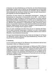 in Bereichen der Gesundheitsförderung und Prävention, der Gesundheitsversorgung benachteiligter Gruppen sowie im Rahmen der Gesundheitsplanung auf kommunaler Ebene. Nicht zuletzt die COVID-19-Pandemie hat verdeutlicht, dass der Öffentliche Gesundheitsdienst über alle Ebenen hinweg noch besser auf akute Herausforderun- gen eingestellt und strukturell aufgestellt sein muss. Gemeinsam mit einem externen und unabhängigen Expertenbeirat — berufen vom Bundesminister für Gesundheit im Einvernehmen mit der GMK - soll der ÖGD in Deutschland auf dieser Grundlage für kommende Pandemien und andere nationale gesundheitliche Notlagen organisatorisch und rechtlich auf ein angepasstes Funda- ment gestellt werden. Kommunikationswege müssen beschleunigt und vereinfacht und der Öffentliche Gesundheitsdienst in Krisensituationen zügig umstrukturiert werden können. Zur personellen Unterstützung sollen sowohl internes Personal außerhalb des Bereiches „Infektionsschutz“ als auch externe Freiwillige im Krisenmanagement fort- gebildet und als „Freiwilligen-Pools“ eingesetzt werden. Bund und Länder verständigen sich daher darauf, bis zum 31. Dezember 2021 Berei- che für weitere strukturelle Anpassungen zu definieren und einen Umsetzungsplan vorzulegen. Hierbei wird das von der GMK verabschiedete Leitbild für einen modernen Öffentlichen Gesundheitsdienst berücksichtigt. Eine gute Gesundheitsberichterstattung bildet hierbei die Grundlage für die Planung von Maßnahmen sowohl in Bezug auf die Gesundheitsförderung, Prävention, Bera- tung als auch das Krisenmanagement. 6. Umsetzung Für die Umsetzung des Paktes für den Öffentlichen Gesundheitsdienst stellt der Bund Finanzmittel in Höhe von 4 Milliarden Euro bereit. Um den notwendigen besonderen Anforderungen zur Stärkung des ÖGD im Rahmen dieses Paktes gerecht zu werden, stellt der Bund den Ländern gegen Nachweis ein- malig Mittel in Höhe von 3.100 Millionen Euro - aufgeteilt auf sechs Tranchen - durch Festbeträge im Rahmen der vertikalen Umsatzsteuerverteilung zur Verfügung. Die Mit- tel fließen vorrangig in den vereinbarten Personalaufwuchs und die Stärkung der At- traktivität der Tätigkeit im ÖGD. Die Aufteilung der Finanzmittel wird wie in der folgen- den Tabelle dargestellt erfolgen: Haushaltsjahr Millionen Euro Insgesamt (Bund) (6 Jahre) 2021 200 2022 350 2023 500 2024 600 2026 750