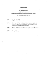 Tagesordnung für die Besprechung der Bundeskanzlerin mit den Regierungschefinnen und Regierungschefs der Länder am 14. Oktober 2020, 14.00 Uhr TOP 1 Lagebericht BMG TOP 2 Gespräch mit Prof. Dr. Michael Meyer-Hermann, Leiter der Abteilung System Immunologie am Helmholtz-Zentrum für Infektionsforschung in Braunschweig TOP 3 Weitere Maßnahmen zur Eindämmung der Corona-Pandemie TOP 4 Verschiedenes