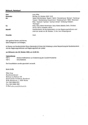 Mirbach, Reinhard Von: Gesendet: An: Cc: Betreff: Priorität: Sehr geehrte Damen und Herren, liebe Kolleginnen und Kollegen, Jung, Mike Montag, 26. Oktober 2020 15:29 '"Baden-Württemberg'; 'Bayern'; 'Berlin‘; "Brandenburg'; 'Bremen'; 'Hamburg'; 'Hessen'; "Mecklenburg-Vorpommern'; 'Niedersachsen'; 'NRW'; 'Rheinland Pfalz‘; 'Saarland'; "Sachsen'; 'Sachsen-Anhalt'; 'Schleswig-Holstein‘; ‘Thüringen’ Dietz, Hans; Miehe-Nordmeyer, Gesa; Kibele, Babette; Diehr, Christian; ref122; ref312; Enderlein, Almut Videokonferenz der Bundeskanzlerin mit den Regierungschefinnen und - chefs der Länder am 28. Oktober, 13 Uhr, hier: Einladungsmail Hoch im Namen von Bundesminister Braun übersende ich Ihnen die Einladung zu einer Besprechung der Bundeskanzlerin mit den Regierungschefinnen und Regierungschefs der Länder am Mittwoch, den 28. Oktober 2020, um 13.00 Uhr. Tagesordnung: TOP1 Weitere Maßnahmen zur Eindämmung der Covid19-Pandemie TOP 2 Verschiedenes Die Einwahldaten werden gesondert versandt. Beste Grüße Mike Jung Bundeskanzleramt Referent im Referat 122 Bund-Länder-Verhältnis; Bundesrat Willy-Brandt-Str. 1, 10557 Berlin Tel.: 030 18400-2251 Fax: 030 18400-1805 E-Mail mike. junge@bk.bund.de