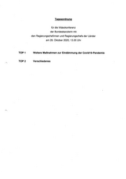 Tagesordnung für die Videokonferenz der Bundeskanzlerin mit den Regierungschefinnen und Regierungschefs der Länder am 28. Oktober 2020, 13.00 Uhr TOP 1 Weitere Maßnahmen zur Eindämmung der Covid19-Pandemie TOP 2 Verschiedenes