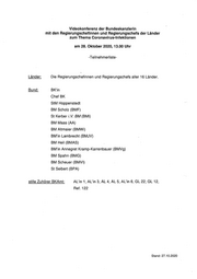 Videokonferenz der Bundeskanzlerin mit den Regierungschefinnen und Regierungschefs der Länder zum Thema Coronavirus-Infektionen am 28. Oktober 2020, 13.00 Uhr -Teilnehmerliste- Länder: Die Regierungschefinnen und Regierungschefs aller 16 Länder. Bund: BK'in Chef BK StM Hoppenstedt BM Scholz (BMF) St Kerber i.V. BM (BMI) BM Maas (AA) BM Altmaier (BMWi) BM’in Lambrecht (BMJV) BM Heil (BMAS) BM’in Annegret Kramp-Karrenbauer (BMVg) BM Spahn (BMG) BM Scheuer (BMVI) St Seibert (BPA) stille Zuhörer BKAmt: AL’in 1, AL’in 3, AL 4, AL 5, AL’in 6, GL 22, GL 12, Ref. 122 Stand: 27.10.2020