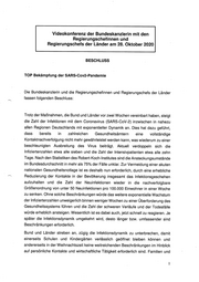 Videokonferenz der Bundeskanzlerin mit den Regierungschefinnen und Regierungschefs der Länder am 28. Oktober 2020 BESCHLUSS TOP Bekämpfung der SARS-Cov2-Pandemie Die Bundeskanzlerin und die Regierungschefinnen und Regierungschefs der Länder fassen folgenden Beschluss: Trotz der Maßnahmen, die Bund und Länder vor zwei Wochen vereinbart haben, steigt die Zahl der Infektionen mit dem Coronavirus (SARS-CoV-2) inzwischen in nahezu allen Regionen Deutschlands mit exponentieller Dynamik an. Dies hat dazu geführt, dass bereits in zahlreichen Gesundheitsämtern eine vollständige Kontaktnachverfolgung nicht mehr gewährleistet werden kann, was wiederum zu einer beschleunigten Ausbreitung des Virus beiträgt. Aktuell verdoppeln sich die Infiziertenzahlen etwa alle sieben und die Zahl der Intensivpatienten etwa alle zehn Tage. Nach den Statistiken des Robert-Koch-Institutes sind die Ansteckungsumstände im Bundesdurchschnitt in mehr als 75% der Fälle unklar. Zur Vermeidung einer akuten nationalen Gesundheitsnotlage ist es deshalb nun erforderlich, durch eine erhebliche Reduzierung der Kontakte in der Bevölkerung insgesamt das Infektionsgeschehen aufzuhalten und die Zahl der Neuinfektionen wieder in die nachverfolgbare Größenordnung von unter 50 Neuinfektionen pro 100.000 Einwohner in einer Woche zu senken. Ohne solche Beschränkungen würde das weitere exponentielle Wachstum der Infiziertenzahlen unweigerlich binnen weniger Wochen zu einer Überforderung des Gesundheitssystems führen und die Zahl der schweren Verläufe und der Todesfälle würde erheblich ansteigen. Wesentlich ist es dabei auch, jetzt schnell zu reagieren. Je später die Infektionsdynamik umgekehrt wird, desto länger bzw. umfassender sind Beschränkungen erforderlich. Bund und Länder streben an, zügig die Infektionsdynamik zu unterbrechen, damit einerseits Schulen und Kindergärten verlässlich geöffnet bleiben können und andererseits in der Weihnachtszeit keine weitreichenden Beschränkungen im Hinblick auf persönliche Kontakte und wirtschaftliche Tätigkeit erforderlich sind. Familien und