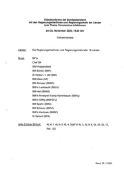 Videokonferenz der Bundeskanzlerin mit den Regierungschefinnen und Regierungschefs der Länder zum Thema Coronavirus-Infektionen am 25. November 2020, 14.00 Uhr -Teilnehmerliste- Länder: Die Regierungschefinnen und Regierungschefs aller 16 Länder. Bund: BKin Chef BK StM Hoppenstedt BM Scholz (BMF) St Kerber i.V. BM (BMI) BM Maas (AA) BM Altmaier (BMWi) BM’in Lambrecht (BMJV) BM Heil (BMAS) BM’in Annegret Kramp-Karrenbauer (BMVg) BM'’in Giffey (BMFSFJ) BM Spahn (BMG) BM Scheuer (BMV|I) BM'’in Karliczek (BMBF) St Seibert (BPA) stille Zuhörer BKAmt: AL’in 1, AL’in 3, AL 4, StäV‘in AL 5, AL’in 6, GL 22, GL 12, Ref. 122 Stand: 25.11.2020