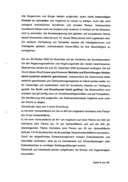 exponentielle Anstiegskurve konnte abgeflacht werden. Das ist ein Erfolg, denn es zeigt, dass die getroffenen Maßnahmen greifen. In vielen Teilen unseres Landes stagniert der Anstieg der 7-Tage-Inzidenz oder ist teilweise sogar bereits rückläufig. Das Helmholtz-Zentrum für Infektionsforschung hat nach jüngsten Erkenntnissen aus den ermittelten Daten feststellen können, dass durch die Maßnahmen, die nun seit drei Wochen in Kraft sind, die Kontakte um 40 Prozent reduziert worden sind. Dies hat das exponentielle Wachstum gebremst. Doch auch wenn sich die Zahlen auf hohem Niveau stabilisieren, kann längst keine Entwarnung gegeben werden. Denn nach wie vor sind die Infektionszahlen vielerorts zu hoch. Die erhoffte Trendwende konnte im November noch nicht erreicht werden, bisher ist lediglich ein „Seitwärtstrend“ zu beobachten. Am 20. November verzeichnete das Robert-Koch-Institut (RKI) für Deutschland einen neuen Höchstwert: 23.648 Neuinfektionen wurden von den Gesundheitsämtern binnen 24 Stunden an das RKI gemeldet. Damit ist das eigentliche Ziel einer deutlichen Reduktion der Neuinfektionen bisher nicht erreicht. Vor diesem Hintergrund können die am 28. Oktober getroffenen Maßnahmen noch nicht aufgehoben werden. Ein Wert von 50 Infektionen pro 100 000 Einwohnern, der zudem auch eine Kontaktverfolgung gewährleistet, ist noch nicht erreicht und gilt weiterhin wie in $28a InfSchG vorgesehen als Orientierungsmarke bei Entscheidungen für Lockerungen. Für die Beurteilung aller Aspekte der Pandemie werden weitere Indikatoren zur Überlastung des Gesundheitssystems sowie solche, die zusätzliche Aussagen insbesondere zur Infektionsdynamik ermöglichen, wie der R-Wert oder die Verdopplungszeit, herangezogen. Es ist daher weiterhin dringend erforderlich, alle nicht notwendigen Kontakte unbedingt zu vermeiden und dort, wo Begegnungen stattfinden, die AHA+AL Regeln (Abstand, Hygienemaßnahmen, Alltagsmasken, CoronaWarnApp, Lüften) stets einzuhalten. Bund und Länder sind sich darüber einig, dass der Präsenzunterricht an Schulen bei diesen Entscheidungen weiterhin höchste Priorität hat. Das Recht auf Bildung kann am besten durch Lernen und Lehren in Präsenz gewährleistet werden. Das gilt für die Jüngeren, die noch wenig Schul- und Lernerfahrung haben, genauso wie für ältere Seite 2 von 15